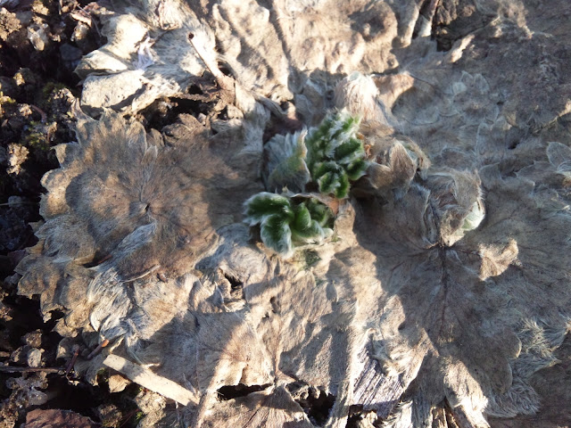 アルケミラモリスは、かなり早くから目が出ていて、古い葉っぱを少し取り除きました。布団でヌクヌクしている感じ。